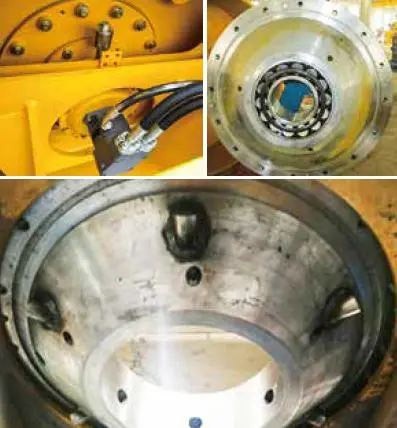 在行走作业时,法兰随振动轮旋转,当纵向小孔转到最低位置时,油流入储油桶。继续向前转时,小孔位置升高,储油桶内的油向外流出,充分润滑轴承。专有的润滑技术,确保振动轴承使用寿命更长。